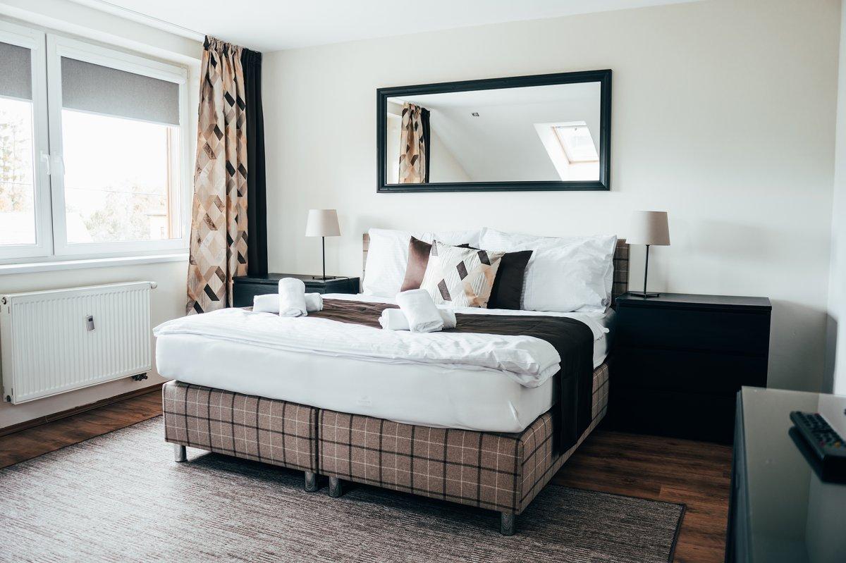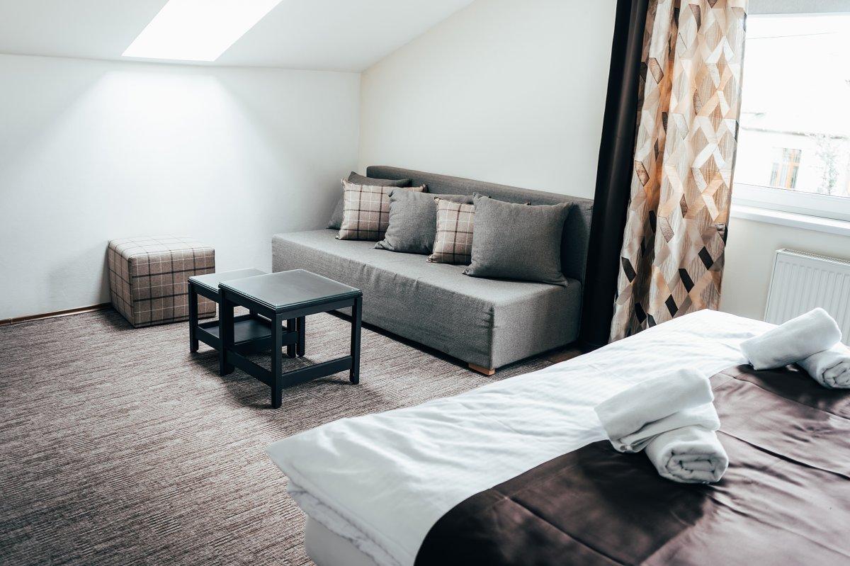 manželskou postelí a rozkládací pohovkou jako přistýlka pro 2