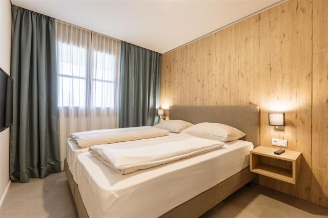 a) 4 - lůžkové apartmány (1 ložnice), Spr.+WC, SAT/TV, fén, balkon nebo terasa. Skládají se z ložnice s manželskou postelí a obývacího pokoje s rozkládací pohovkou pro dva. Apartmány mají plně vybavenou kuchyň (s příbory, nádobím, varnou deskou, troubou, myčkou nádobí, lednicí s mrazákem, toustovačem, varnou konvicí a kávovarem) Průměrná velikost je přibližně 50 m².