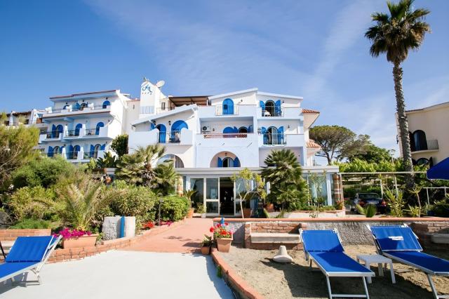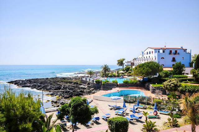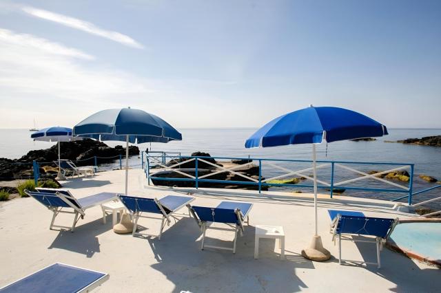 Kamenitá pláž přímo u hotelu (terasa na opalování, lehátka a slunečníky zdarma, vstup do vody po schodech). Veřejná písečná pláž Giardini Naxos cca 500 m, lehátka a slunečníky za poplatek. |